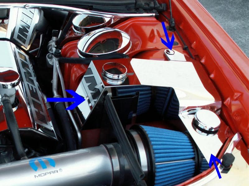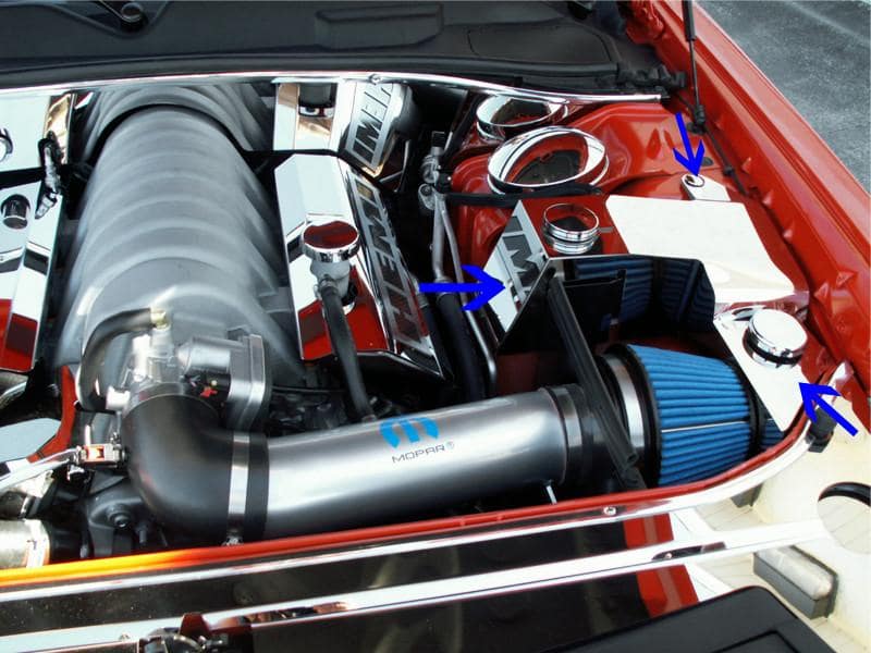 Dress up your Chrysler 300 / Dodge Charger/Magnum with our Polished Stainless Steel, Water Tank/Power Steering Cover with Chrome cap covers. These trim pieces are designed to fit the 2005-2010 Chrysler 300 / Dodge Charger/Magnum 5.7 SRT 8, over the water tank/power steering and add a clean stylish look to your cars engine bay. Compliments our Polished Engine Harness Cover - 303016.