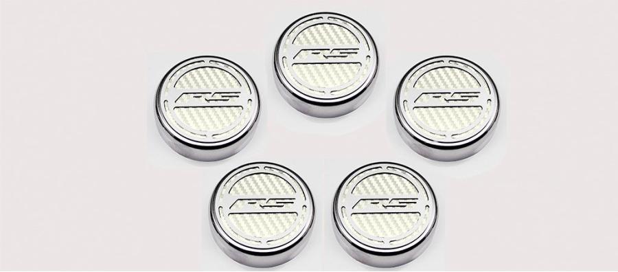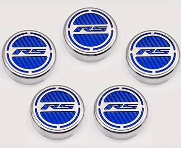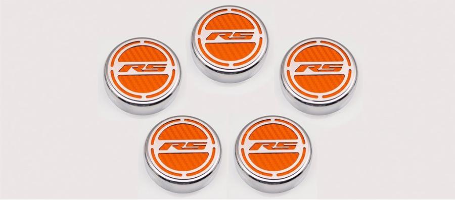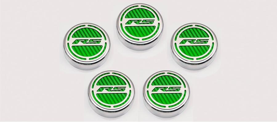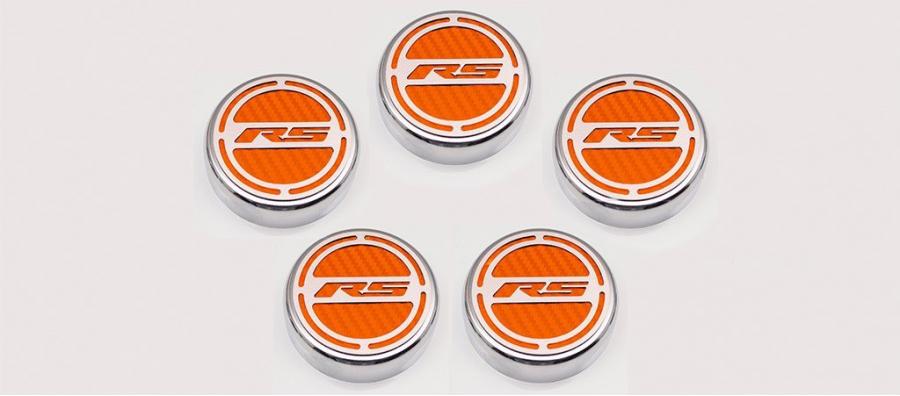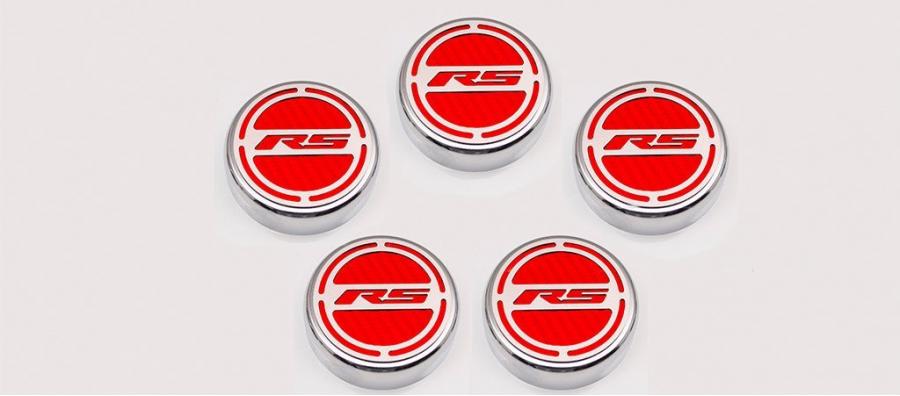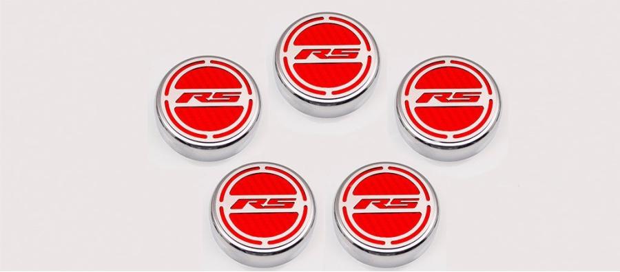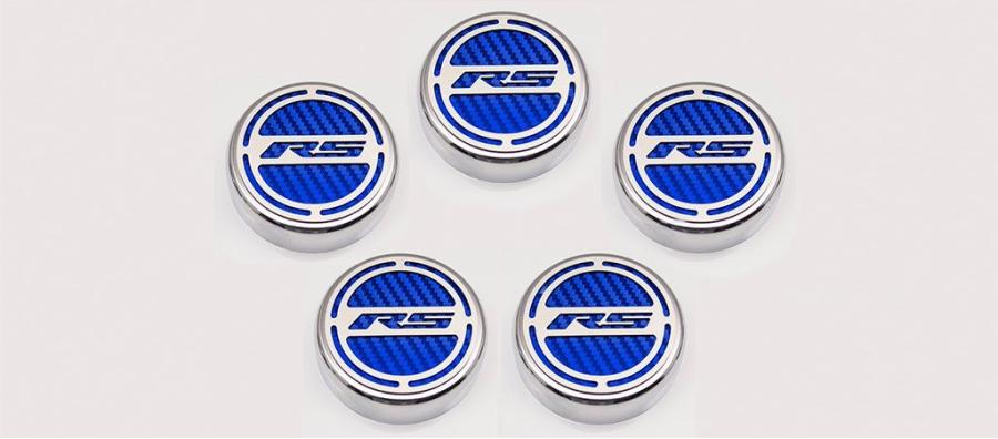 Give your engine bay some style with our all-new, 5-piece, GM Officially Licensed Engine Fluid Cap Cover Set. These triple chrome-plated caps feature high-performance vinyl color inlays and precision-cut "RS" brushed stainless steel tops. They easily install over your factory fluid caps with industrial strength Velcro cookies which are included. This set includes covers for your oil, water, brake, power steering, and windshield washer factory caps.
