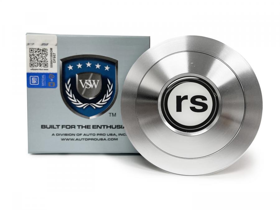 This VSW S9 Premium Billet Aluminum Pressure Fit 9-Bolt Steering Wheel Horn Button with CHEVY RS Emblem is a GM Licensed Product