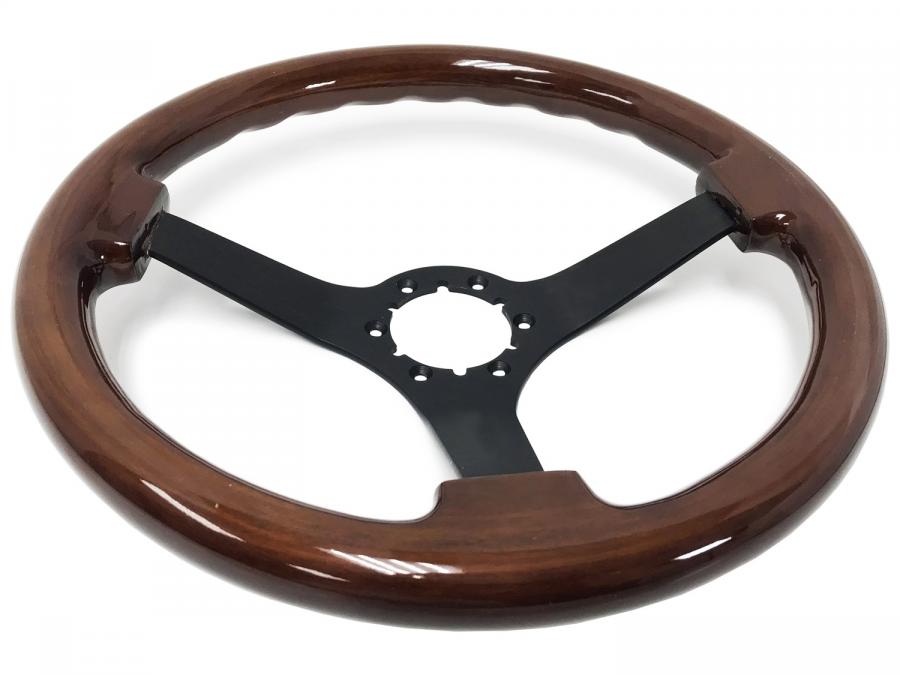 S6 Sport Wood series come in real mahogany wood finish with high quality black center finish and solid spoke design. It features a 14 in. diameter with a 2.5 in. depth for turn signal clearance.