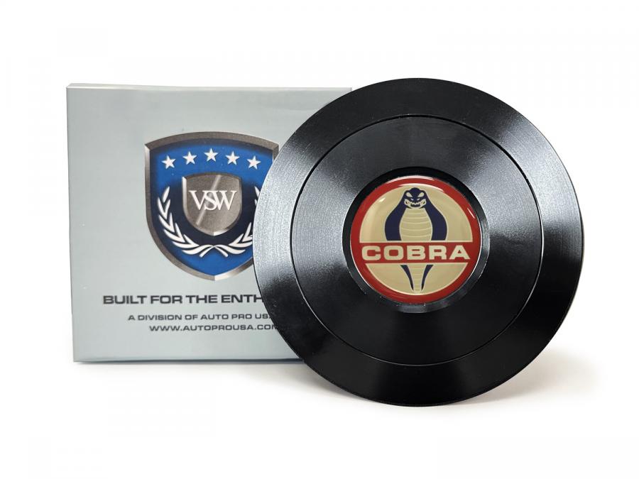 This VSW S9 Black Premium Billet Aluminum Pressure Fit 9-Bolt Steering Wheel Horn Button features a Ford Licensed COBRA Emblem