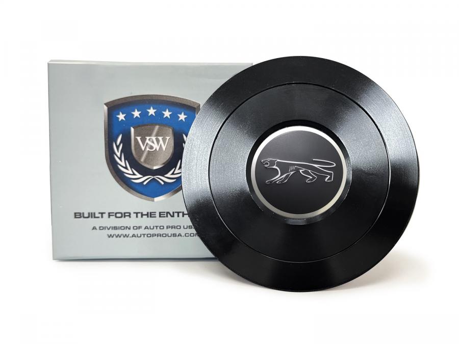 This VSW S9 Black Premium Billet Aluminum Pressure Fit 9-Bolt Steering Wheel Horn Button features a Mercury COUGAR Emblem