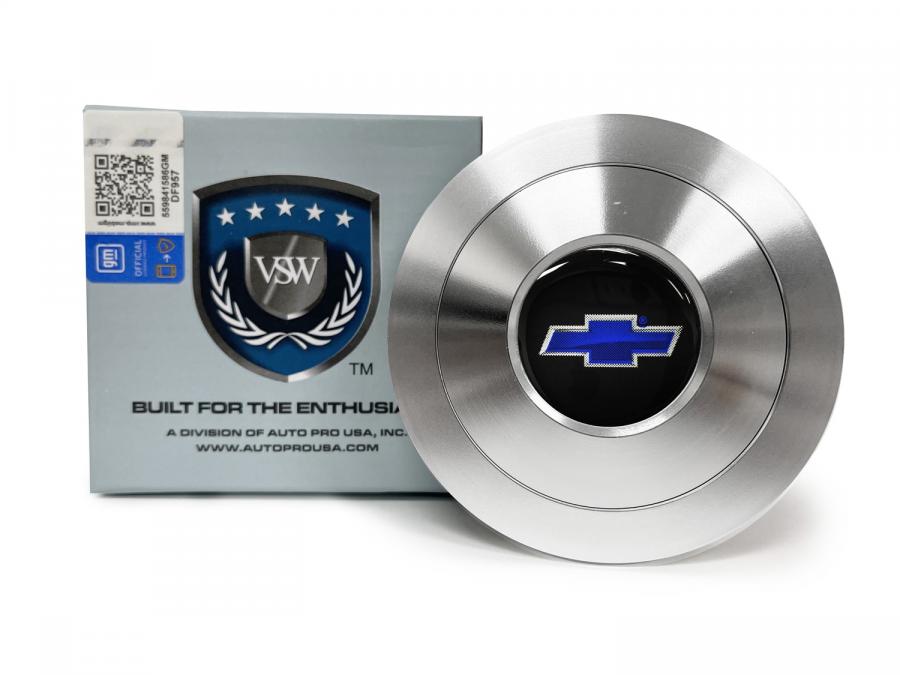 This VSW S9 Premium Billet Aluminum Pressure Fit 9-Bolt Steering Wheel Horn Button with BLUE BOW TIE Emblem is a GM Licensed Product