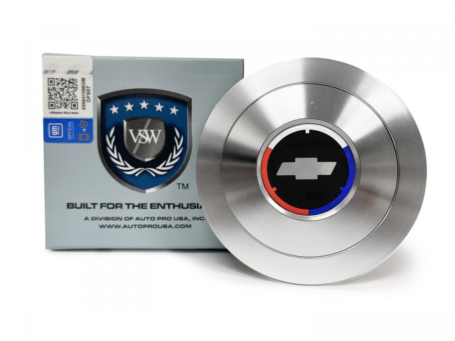 This VSW S9 Premium Billet Aluminum Pressure Fit 9-Bolt Steering Wheel Horn Button with TRI COLOR BOW TIE Emblem is a GM Licensed Product