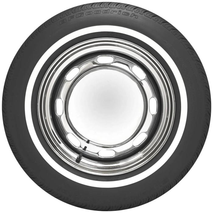 BFGoodrich Radial Narrow white wall tires feature an all-season tread design and are great for classics, hot rods, and customs. 15 inch white wall tires are great fitments on all sorts of classic full-size American cars from the sixties and seventies. The narrow white sidewalls are the right touch, matching the narrower whitewalls from the classics of the late sixties and seventies. BFGoodrich Whitewall Radial tires are DOT and ECE (European Community) approved and backed by our life of the tread warranty. Please note that dimensions listed tread width, section width and overall diameter are non-scientific and based on an inflated tire, mounted on a wheel. Dimensions may vary due to rim width and inflation pressure.