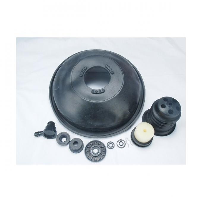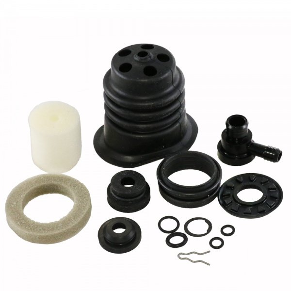 The kit includes the following: Front housing seal, check valve, check valve grommet, push rod o-rings, reaction bumper, lock ring, control valve o-ring, poppet valve, diaphragm, muffler, air rod pin, rear housing seal, and push rod boot rubber.
