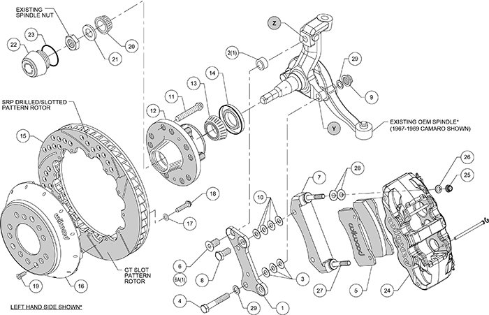 | Chevrolet | Camaro | 1968 - 1969 | KIT,FRONT,CAMARO/NOVA,67-72,AERO6,14.00 ROTOR,RED; RTR:14.00-IN DIA, GT 72 CURVED VANE, SLOTTED; CLPR:AERO6, 6-PISTON, RED POWDER COAT 14" Rotor Universal Flexline kits available: 220-7056 (14"), 220-7699 (16") or 220-8307 (18"). Choose correct length for your application. Universal Parking Brake cable kit, may require modifications to cable or vehicle to install. Z-28 Models with Disc Brake Spindle |