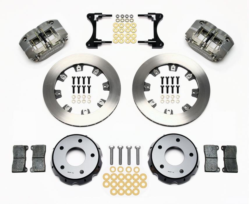 NDPR forged billet, radial mount four piston calipers are used in this select group of drag racing kits. The OE brakes on vehicles originally equipped with 16” or larger wheels generally do not fit inside the popular 15” drag wheels. Specially designed radial caliper mount brackets bolt directly to the OE caliper mount, and provide secure and accurate mounting for the NDPR caliper. Kits with 3/8” steel rotors are recommended for four-wheel disc brake cars up to 2,800 pounds. Kits with .81” rotors should be used on cars over 2,800 pound cars, or lighter cars running extreme speeds desiring increased rotor durability.
