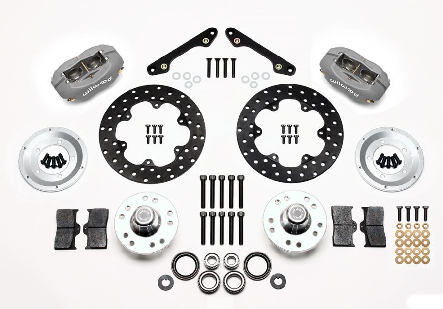 FDL Front Drag kits are drag racing’s most popular front brake kits. FDL kits are available for the popular muscle car spindles and select aftermarket front struts used on four-wheel disc cars weighing up to 2,800 pounds, or rear drum brake equipped cars weighing up to 2,400 pounds. Forged billet FDL four piston calipers mount directly to the spindle with a bolt-on bracket. Forged billet, five lug hubs with direct mount steel rotors combine to provide an average weight savings of over 30 pounds compared to stock drum or disc brakes. Kits include all new hardware, wheel bearings, seals and extra length lug studs.