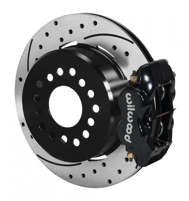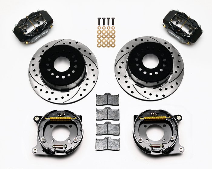 This group of FDL Pro-Series rear disc kits provides a complete solution for popular muscle car rear axles that require a parking brake. Forged billet Dynalite four piston calipers, 12.19” one-piece drum/rotors, and high friction pads provide optimized and balanced braking for all types of custom performance street/strip and show machines. The neatly hidden internal shoe system provides a clean installation with superior static holding power for parking. Optional caliper finishes and rotor designs enable the builder to personalize the style and optimize brake performance for every individual application.