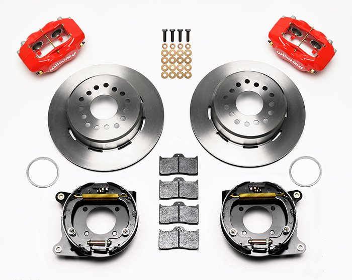 This group of FDL Pro-Series rear disc kits provides a complete solution for popular muscle car rear axles that require a parking brake. Forged billet Dynalite four piston calipers, 12.19” one-piece drum/rotors, and high friction pads provide optimized and balanced braking for all types of custom performance street/strip and show machines. The neatly hidden internal shoe system provides a clean installation with superior static holding power for parking. Optional caliper finishes and rotor designs enable the builder to personalize the style and optimize brake performance for every individual application.