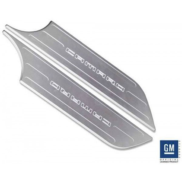 Officially Licensed Product 6061 Aircraft Grade Billet Aluminum GM Officially Licensed Product.Customize the look of your kick panels while protecting your door panel from everyday wear and tear. Crafted from extra thick 1/4 inch 6061 aircraft grade aluminum billet and engraved with the Camaro logo. Adhesive-backed with 3M automotive tape for easy installation. Set of 2. Four year limited warranty.