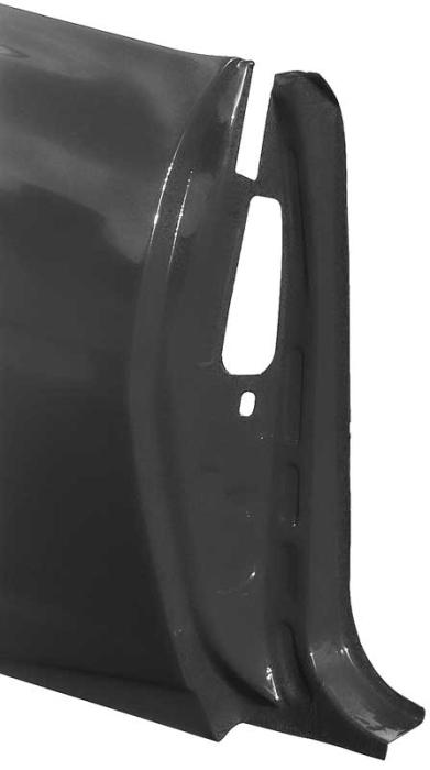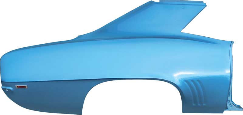 Reproduction complete quarter panel for 1969 Camaro coupe models. Each panel is precision-manufactured in high-quality stamped steel to original factory specifications for an authentic fit and finish. Unlike a simple quarter skin, this panel replaces the entire quarter section including the door jamb, trunk gutter, upper sail panel, and more. Designed to attach at the original factory seams, ensuring a seamless restoration. Finished in durable black EDP (electrophoretically deposited) coating for long-lasting rust and corrosion protection.
