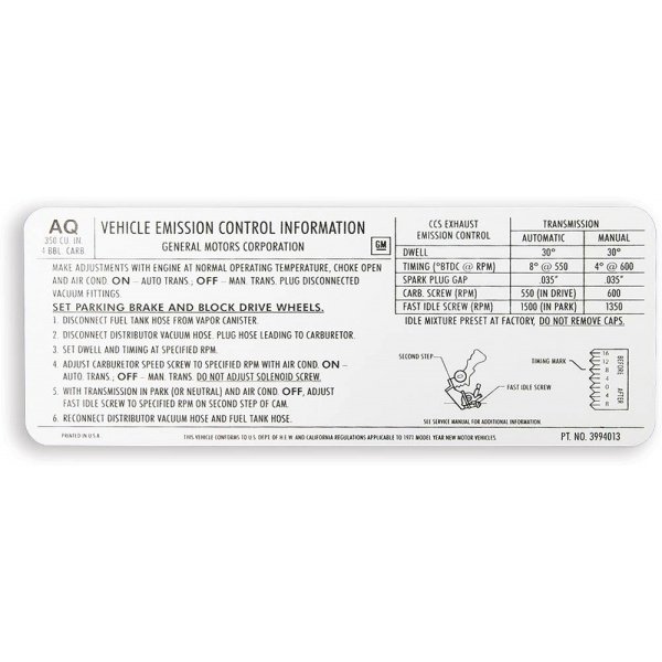 Camaro Emission Decal, Automatic Or Manual Transmission, California, 350ci/270hp, 1971