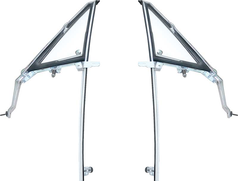 Reproduction door vent glass assembly for 1967 Camaro and Firebird models. This complete vent glass window frame assembly is manufactured to exact factory specifications specifically designed to replace the complete assembly for bent or damaged original vent window frames. Each complete assembly features a chrome frame, vent window handle, clear vent window glass with rubber seals, and division bar that includes the felt insert. Adjuster screws are also included making installation easier. Installs on passenger side (RH).