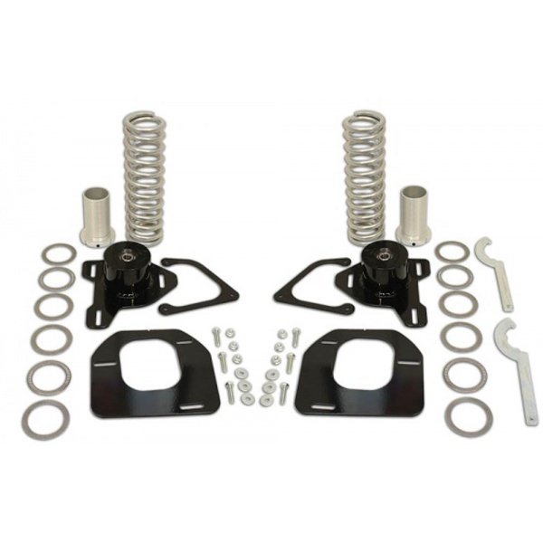 New Fabricated Upper Strut Mounts And Reinforcing Plates (Powdercoated Black) CNC 6061 T-6 Strut Sleeves And Lower Spring Mounts (Clear Hard Anodized Coating) Works With All Struts Except Bilstein (Struts Not Included) Easy Ride Height Adjustments Using Included Spanner Wrench CNC Laser Cut 1/4 Steel Mounting Plates 300 lb. Springs (325 or 350 Also Available) Coil-Over suspension allows for more suspension travel, adjustability, and a much better ride. The new fabricated upper shock mounts contain new upper spring pockets. The undersides feature 1/4 CNC laser cut steel reinforcing plates. The upper and lower spring pockets include torrington bearings and thrust washers to prevent coil bind. Ride height can be adjusted in minutes using the included spanner wrench.