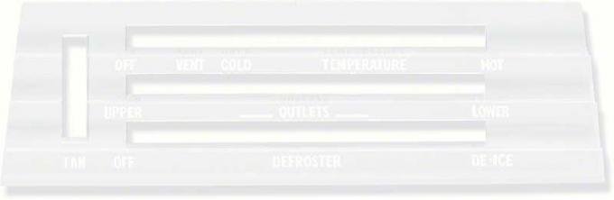 Reproduction of the original heater control lens designed for use on 1968 Camaro and Firebird models with air conditioning. Each heater lens is manufactured in quality acrylic lens material using injection molded process. Features precision screened lettering in translucent white for correct appearance.