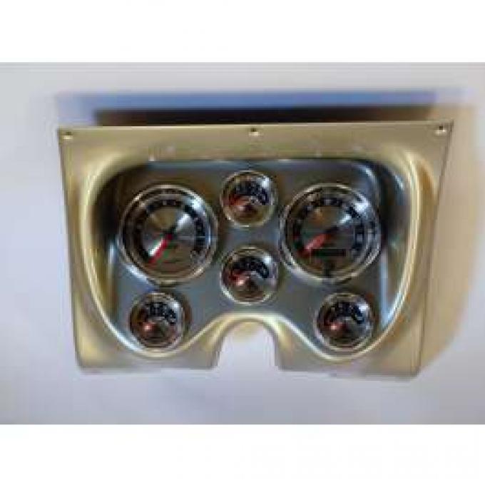 Thermoformed ABS Plastic Is Strong And Stylish Impregnated With UV Blocker To Protect From Sun Damage Includes Autometer American Muscle Gauges & Harness That Connects To Stock Dash Wiring Kits Also Include LED Turn Signals, High Beam Bright Anodized Bezels White LED With Through Dial Lighting Technology & Glowing Red Pointers 3-3/8 10,000 RPM Tach, & 160 MPH Speedometer 2-1/16 Voltage, Oil Pressure, Temperature, & Fuel Speedometer Sender Not Included, Please See P/N SS-900 A new instrument cluster is the best way to end or begin your Camaro's restoration. The base panel is made of multiple layers of tough ABS plastic that is vacuum formed at 320*F with a brushed aluminum finish. They are machined on a 5-axis CNC to insure a perfect fit to your dash. The kit includes Autometer American Muscle series gauges which are all electrical. Wiring harness and LED's are also included for the turn signal, and high beam