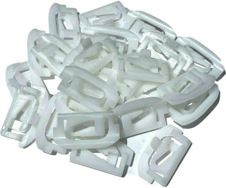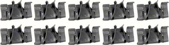 Reproduction of the original stamped convertible well molding clip set for use with various 1967-72 Buick, Chevrolet, Pontiac, and Oldsmobile convertible models as listed. These clips are designed and manufactured to secure the rear convertible well chrome molding around the rear convertible top well. Each clip is manufactured in quality stamped steel and heat treated for strength and durability. This set includes 10 clips, the correct quantity required for Camaro and Firebird models. For other listed applications, use as required.