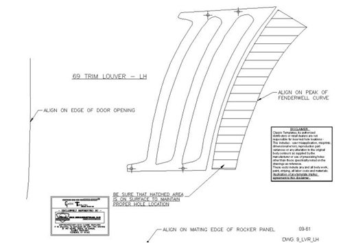 69 Quarter panel louver placement templates makes the difficult task of drilling the stud holes in your quarter panels for new installations worry free. Classic Templates easy to use full size digitally rendered placement templates exactly locate all body holes quickly and professionally. Templates also available for all 67-69 exterior body emblem combinations, 67-68 RS lower body moldings, RS backup lamps, antenna hole placement, sidemarker locations and 68-69 Standard to RS fenderwell templates.