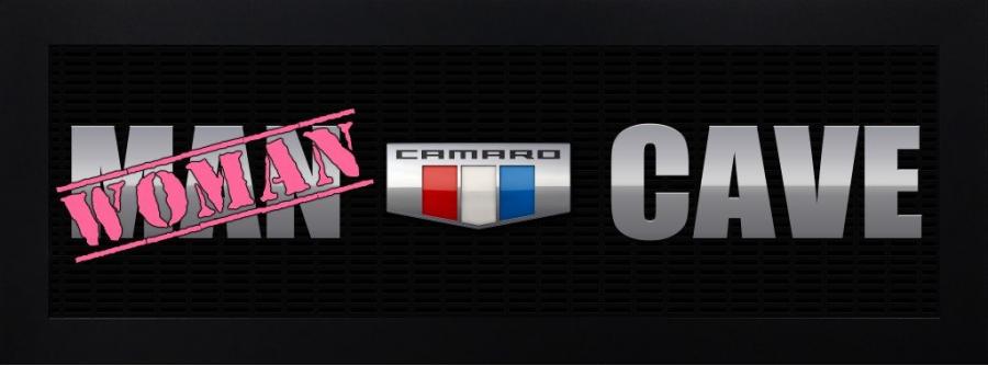 Camaro Six Badge Woman Cave Framed Print. Carefully mounted and protected under glass. Framed with a Black Bison Wood Frame that measures 1.75", with a wire hanger on the back side. Total framed print measures 13" x 35".