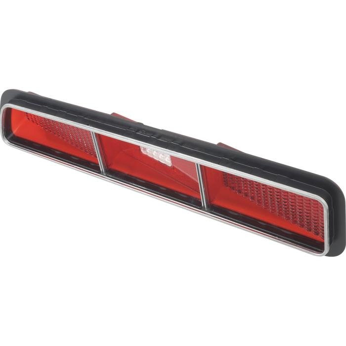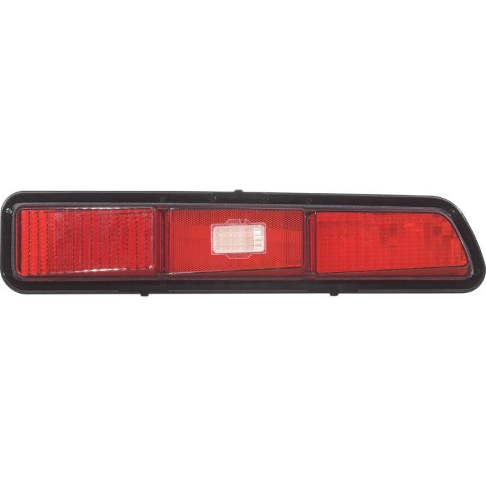 Reproduction rear tail light lens for all 1969 Camaro standard, SS & Z28 models without the Rally Sport option. Each lens is manufactured to exact factory specifications. Each lens features correct SAE and "Guide" markings for authenticity. This lens also includes correct stainless steel trim around the outer edge along the two vertical stainless trim moldings that separate the three sections of the lens. The back up lamp lens is a small white rectangular section in the center of the tail lamp lens.