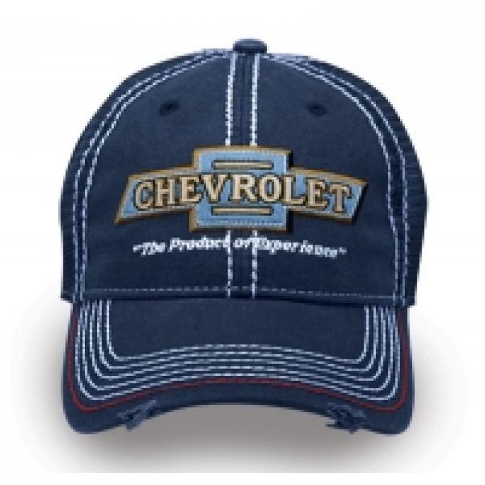 Color Matched Mesh Back Adjustable Velcro Strap Imported The Product of Experience This Vintage Chevrolet Cap features a classic Bowtie logo and a slogan that speaks for itself. The color matched mesh backing frees body heat from its prison against your head to keep you cool while the distressed visor keeps the sun out of your eyes. People who think they are clever may question the purchase of a cap that includes wear and tear as standard equipment, but you will know that they are simply jealous of your impeccable style and good taste. Available in Red or Navy.