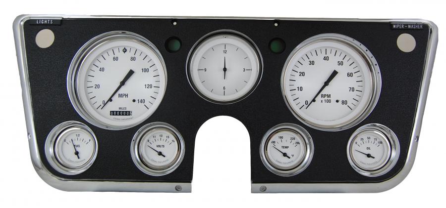 The 1967-72 Chevy Truck Package with our White Hot Series installed, features a 4 5/8" Speedometer and tachometer, 3 3/8" Clock, and 2 1/8" Fuel (0-90 OHM), Oil, Temp, and Volt gauges. A blue LED high-beam indicator is installed in the speedometer. The set includes pre-wired electrical connections, mounting hardware, all necessary* sending units, and a wiring harness constructed of automotive grade TXL wire, machine-crimped terminals, tech-flex sleeving, and Molex main connectors. It is equipped with our ZST™ and works directly with ECM or VSS signals so no additional control box is needed.