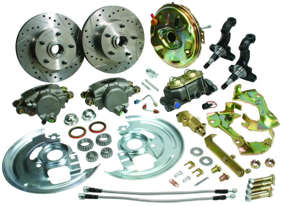 The CPP Complete Disc Brake Kit with Vacuum Booster with OEM Stock Disc Spindles (Part Number 6474FBP-9-UGR) fits 1964-1972 GM A Body, 1967-1969 F Body, and 1968-1974 X Body. Features 11" rotors and a 9" booster. Includes drilled and slotted design. Comes with stainless hoses and red calipers.