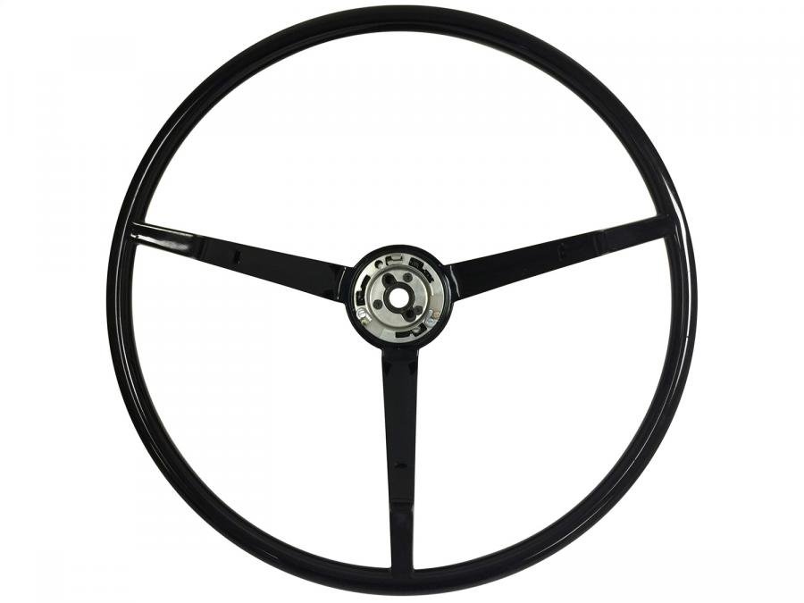 This high quality OE style correct 15 in. reproduction steering wheel has been crafted using injection molded method, just like the factory original. It features direct bolt on fitment and uses all of your factory horn button and mounting parts. Available in black.