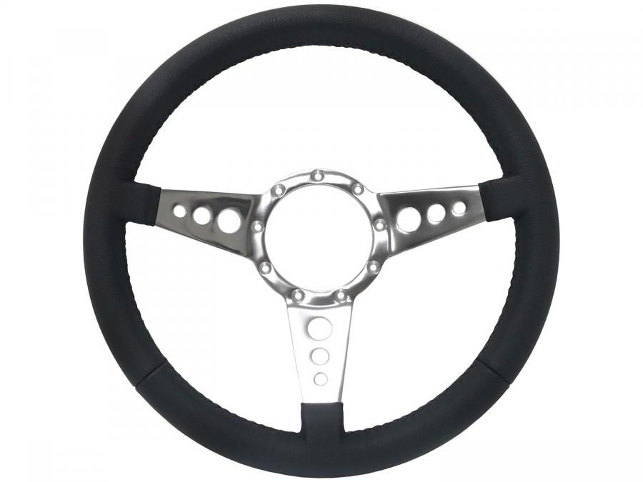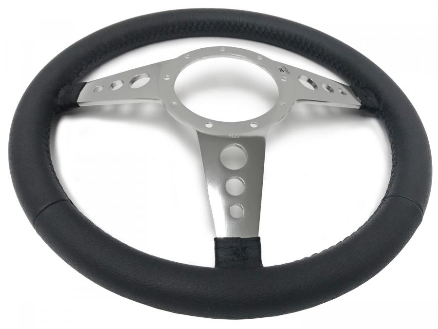 S9 steering wheel series come in premium leather grip option with polished aluminum anodized center finish. They feature a 14 in. diameter with a 2 in. depth for turn signal clearance. The grip thickness is 1.25 in.