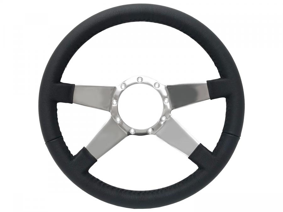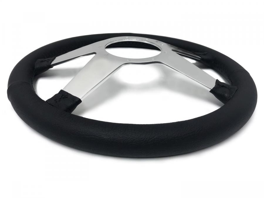 S9 steering wheel series come in premium leather grip option with polished aluminum anodized center finish. They feature a 14 in. diameter with a 2 in. depth for turn signal clearance. The grip thickness is 1.25 in.