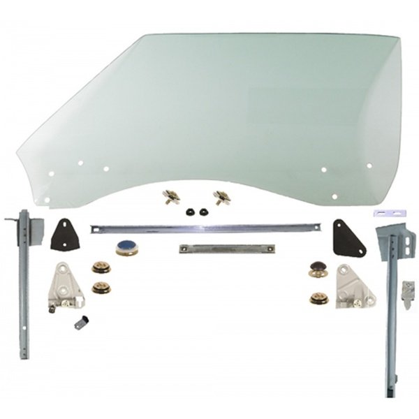 Kit Includes: OE thickness door glass, superior quality roller plate assemblies with correct mounting stud assemblies, plate gaskets, front and rear window stops, front and rear glass tracks, inner sash, upper rear window track plate, upper sash with mounting stud assemblies.