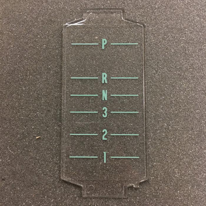 Indicator lens upgrade for a factory console with display for various automatic transmissions. All lenses are clear plastic with mint green lettering.