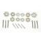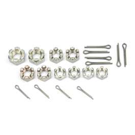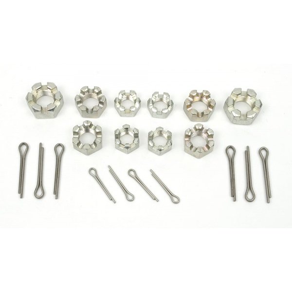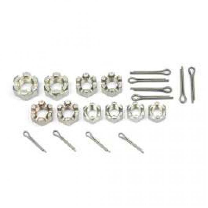 These are the fasteners needed to assemble steering and suspension related components. Most fasteners have correct markings for the time period. This twenty-piece kit includes slotted nuts and cotter pins.