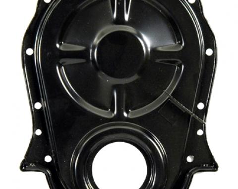 Faithful reproduction in OEM thickness stamped steel includes correct timing tab with "A O R" markings welded to cover as original. The 66 cover has a provision for center bolt to go through the oil pan to timing cover. There is no hole…