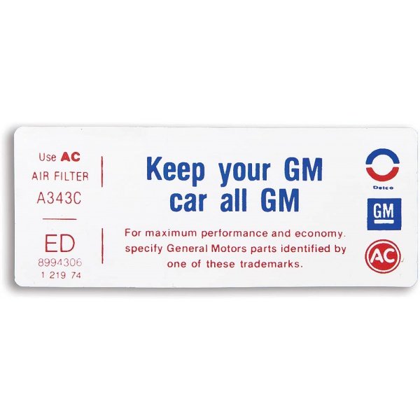 Camaro Air Cleaner Decal, Keep Your GM Car All GM, 1975