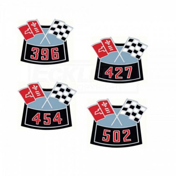 Air cleaner decals add the finishing touch to your engine compartment. These chromed die cast emblems perfectly replicate the original GM crossed flag valve cover decals. Painted accents boast your engine's cubic inches and the famous GM crossed flag logo. The three dimensional emblem gives you a bold alternative to traditional decals.
