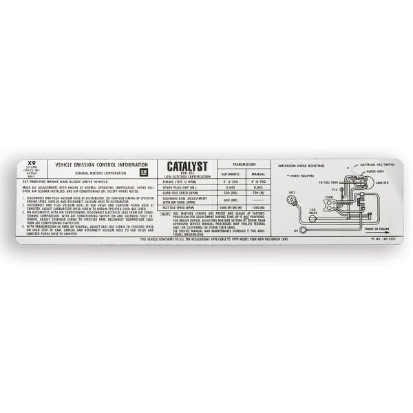 High Quality Reproduction Emissions Label Replaces 350ci Decal X9 Emissions Decals Can Vary, To Verify You Are Ordering The Proper Decal You Must Match The Emissions Code Located On The Corner Of Your Original . Good Condition Decal Required In Some States To Pass Emissions Testing 1979 Camaros sold in California and New York came factory with certain smog requirements including a visible emissions decal under the hood. Many states now have adopted California and New York standards above Federal standards setting the bar that much higher requiring in many cases clear display of these labels and decals. All 1971 and newer Camaros have emissions labels or decals showing that they were manufactured to meet either California or U.S. Federal standards. This Camaro emissions label or decal is affixed in the engine compartment or in a readily accessible location. At the top of this 1979 Camaro X9 emissions label are the words VEHICLE EMISSION CONTROL INFORMATION and the corporate name or trademark of the GM. If you live in an area that requires CARB (California Air Resources Board) or other Federal standards, make sure your emissions system meets requirements by checking with local rules and laws. Remember, most states require your Camaro to possess emission standard equipment in order to pass smog and get registered.