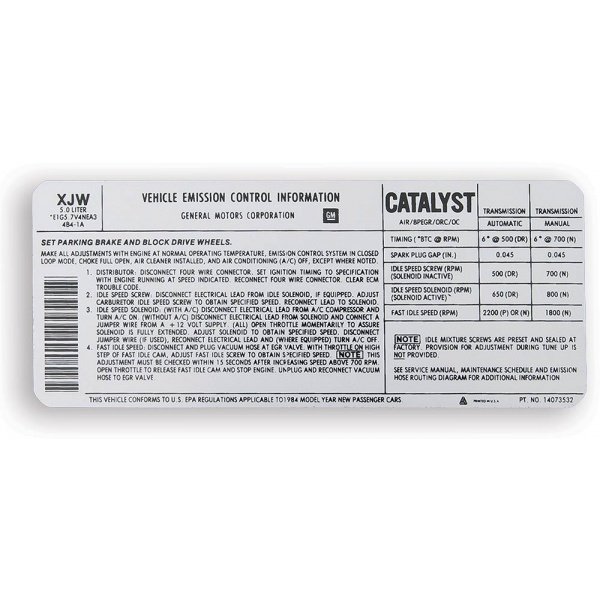 High Quality Reproduction Emissions Label Replaces 305hp Decal Emissions Decals Can Vary, To Verify You Are Ordering The Proper Decal You Must Match The Emissions Code Located On The Corner Of Your Original . Good Condition Decal Required In Some States To Pass Emissions Testing 1984 Camaros sold in California and New York came factory with certain smog requirements including a visible emissions decal under the hood. Many states now have adopted California and New York standards above Federal standards setting the bar that much higher requiring in many cases clear display of these labels and decals. All 1971 and newer Camaros have emissions labels or decals showing that they were manufactured to meet either California or U.S. Federal standards. This Camaro emissions label or decal is affixed in the engine compartment or in a readily accessible location. At the top of this 1984 Camaro Emissions label are the words VEHICLE EMISSION CONTROL INFORMATION and the corporate name or trademark of the GM. If you live in an area that requires CARB (California Air Resources Board) or other Federal standards, make sure your emissions system meets requirements by checking with local rules and laws. Remember, most states require your Camaro to possess emission standard equipment in order to pass smog and get registered.