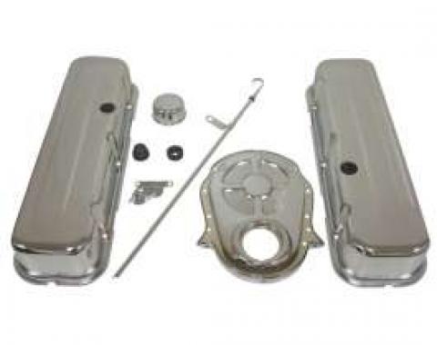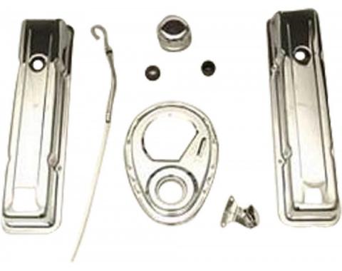 Maximum bang for your buck describes this very popular and economical small block engine dress-up kit. It includes the following shiny chrome plated parts: valve covers, timing chain cover, timing tab, breather cap (for valve cover)…