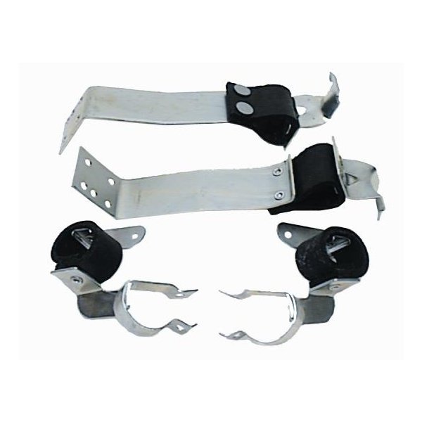 Correct four piece hanger sets for 2 and 2-1/4 dual exhaust factory style systems. Nicely silver zinc plated. Nearly identical reproductions of original system hangers.