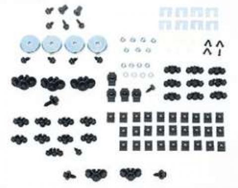 Most technically correct basic front end sheetmetal and grille assembly kit available! Black oxide indented head bolts with washers for front end assembly, cage nuts, fender cup washers, hood and fender bolts and grille mounting hardware.