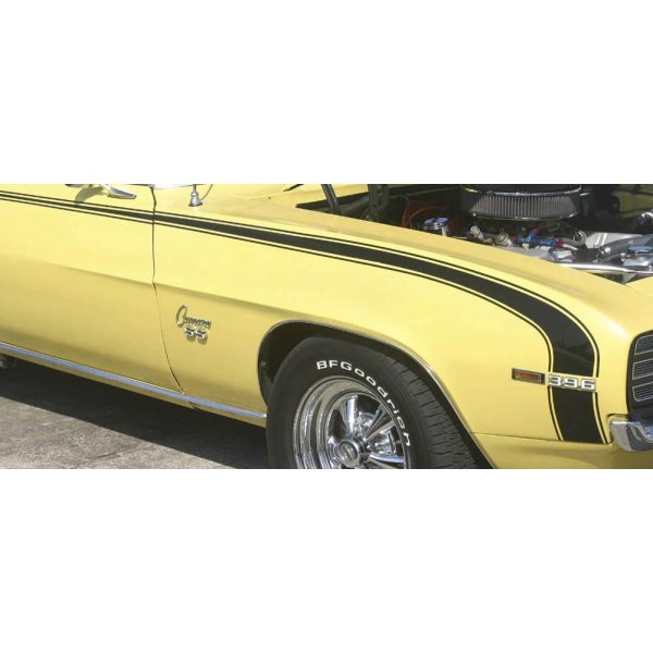 Reproduction Of Original RPO D90 Sport Striping Included With Factory Camaro SS Package D90 Option Available For All Models Except Z28 Includes Paint Stencils For Fenders & Self-Adhesive Vinyl Stripes For Doors GM Recommended Red Striping For Burgundy Exteriors Black Stripe Set Pictured