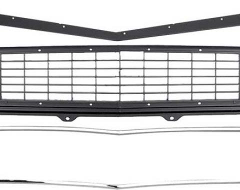 This Restorer's Choice™ grill kit includes a Rally Sport grill, upper and lower grill moldings, and LH and RH headlamp bezels. The upper molding includes the header panel to molding attachment clips. The moldings were originally riveted…