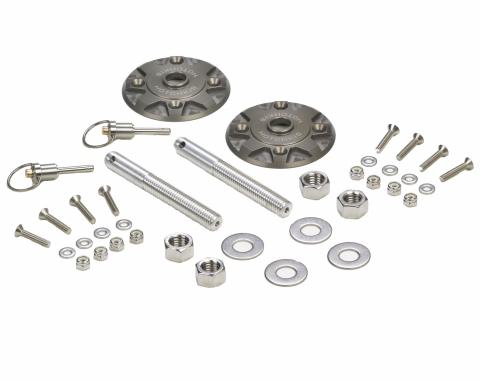 These heavy duty hood pins will secure your hood or trunk yet still allow them to be quickly opened or removed. Every kit includes 2 hood pins, two torsion flip over clips, two self adhesive scuff plates, and the necessary hardware.