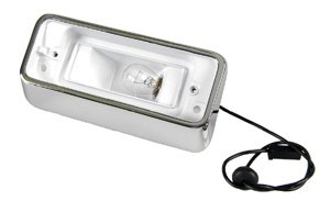 Accurate chromed die-cast reproduction with white enamel inlay. Correct in every way. Housing includes wiring, rubber boot, grommet, bulb and connector. RH (passenger) side only. Officially Licensed GM Restoration Parts.