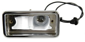 Accurate chromed die-cast reproduction with white enamel inlay. Correct in every way. Housing includes wiring, rubber boot, grommet, bulb and connector. LH (driver) side only. Officially Licensed GM Restoration Parts.
