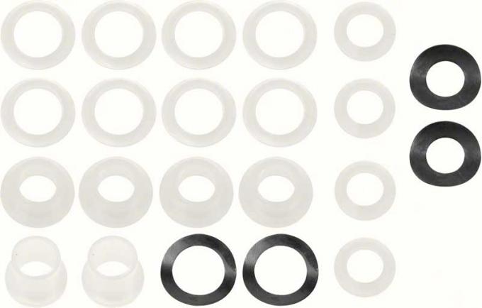 Reproduction of the original bushings needed when rebuilding or adding a Rally Sport grill assembly (concealed headlamps). If your rebuilding a 1968-69 Rally Sport headlamp assembly, then you'll want to replace the upper and lower bushings. These bushings will promote a smooth and efficient operation when the headlamps are activated. Includes bushings and washers for upper and lower. 1 set will repair both RH and LH door assemblies.