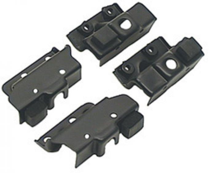 Technically correct limit switch brackets include small rubber molded bumpers. Mounts to headlamp assemblies and radiator core support. Correct four bracket set with attached bumpers.